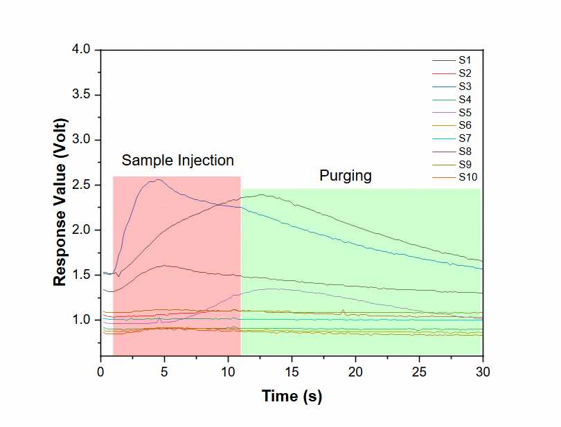 where S(t) is the signal value at time t, capturing the strongest reaction to the sample’s VOCs. The difference method calculates the change between the maximum response and the baseline: