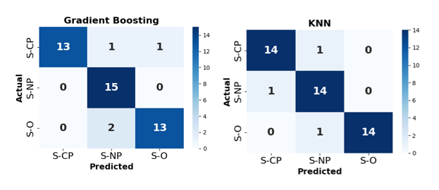 Interestingly, Table 5 also reveals that using principal components as input features yielded mixed results. While some models, such as GB with 2PC input, showed an increase in test accuracy compared to their raw data counterparts, the best-performing model overall (k-NN) achieved its peak performance using the original raw features. This highlights a key consideration: PCA is an unsupervised dimensionality reduction technique that identifies directions of maximum variance, which may not align with the directions of maximum class separability and can discard valuable discriminative information [50]. This is critical in food safety applications, where the nature of misclassification is as important as overall accuracy. For instance, while the GB model with 2PC input had high accuracy, it critically misclassified S-CP as S-O. In contrast, the k-NN model’s only error was classifying S-CP as S-NP, a more conservative and safer outcome.