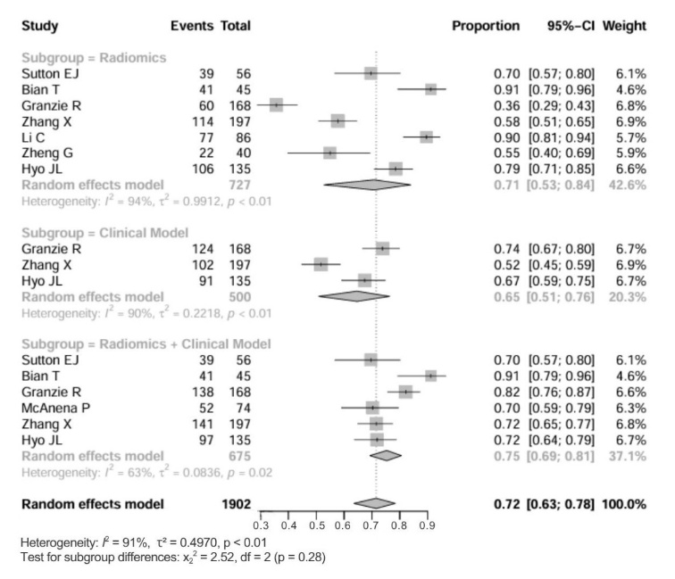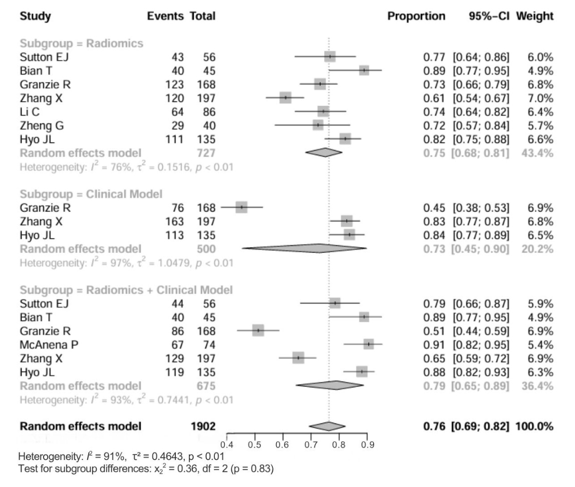 Moreover, integrating radiomic features with clinical data further improved the predictive performance, achieving a pooled accuracy of up to 0.83 and an AUC of up to 0.81. This combination suggests that radiomics can capture subtle imaging biomarkers that, when complemented by clinical parameters, such as age, tumor stage, and molecular subtype, provide a more robust and personalized framework for treatment planning. In clinical practice, this approach may help identify patients most likely to achieve pCR, thus optimizing surgical decision making and offering opportunities for breast-conserving treatment strategies.