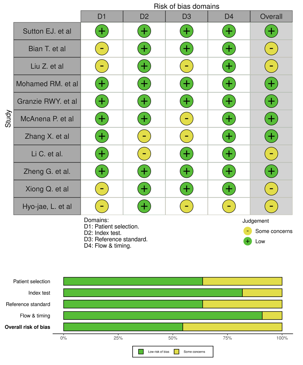 However, several limitations of this study should be considered before routine adoption. The meta-analysis revealed high heterogeneity across studies, likely stemming from differences in MRI protocols, radiomic feature selection, and machine learning algorithms. In addition, the potential publication bias suggested by funnel plot asymmetry raises concerns that favorable or extreme results may have been preferentially published, inflating estimates of diagnostic performance. Therefore, clinicians must be cautious when interpreting and applying these findings in the context of rigorous standardized protocols. Prospective multicenter validation trials with harmonized imaging and analysis pipelines are crucial for confirming these promising results.