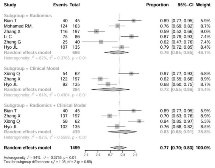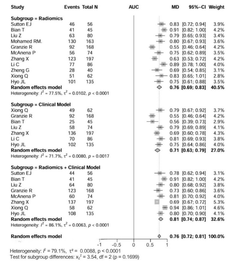 Pooled AUC = 0.78 (95% CI 0.74 - 0.81) for MRI-based radiomics |