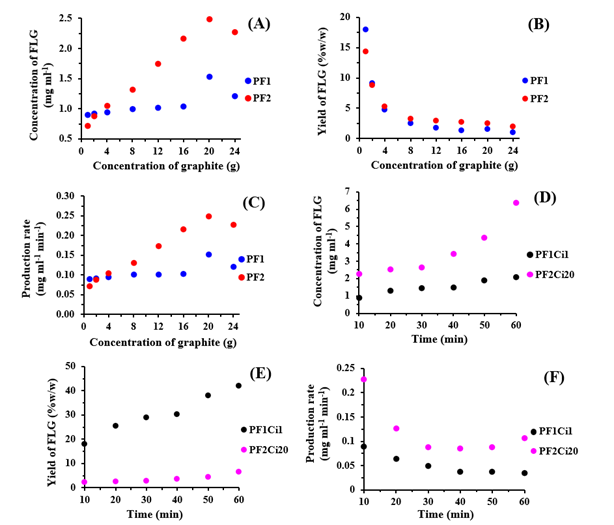 Error! Reference source not found.(A) indicates that as the concentration of graphite increased, the concentration of FLG also grew. The highest FLG concentration was achieved using PF1 and PF2 at 20 g of graphite and 10 min of exfoliation time, yielding 1.52 and 2.49 mg mL −1 , respectively. This suggests that the PF2 process might have enhanced efficiency in producing FLG, potentially due to surfactant interactions. In addition, the yield of FLG as a percentage ( Error! Reference source not found.(B) ) decreased with the concentration of graphite. PF1 generally shows higher yield (17.94%) compared to PF2 (14.28%) at the lower graphite concentrations, but decreases sharply as graphite increases. Additionally, the production rate of FLG (Error! Reference source not found.C) had an increasing trend with the concentration of graphite. This indicates that, despite the drop in yield, the total amount of FLG produced per unit of time does rise with amount of graphite input.