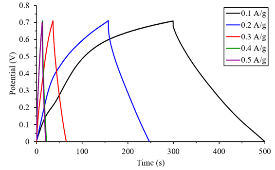 Error! Reference source not found. indicates that when the applied current density rises from 0.1 to 0.5 A g −1 , the discharge time falls considerably. Specific capacitance ( C s ) is a key parameter for quantifying the charge storage capability of a supercapacitor. It can be calculated using the equation: