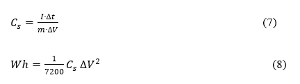 where watt-hours (Wh) are the stored energy. I represents the applied current (A), m represents the mass of active material (g), V represents the potential window (V), and t represents the discharge time of 1 cycle (s).