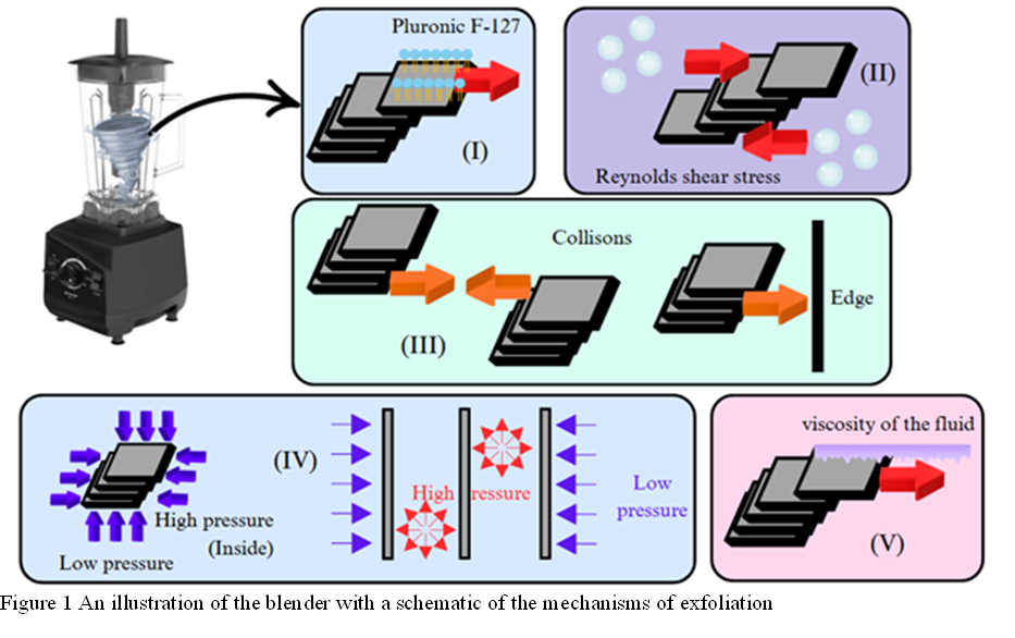 Graphite powder (size 10 µm) was purchased from Tiger Rich System Co., Ltd., and used as supplied. The surfactant used was Pluronic F-127 (PF-127), which was purchased from Sigma Aldrich. In this research, a Sharp blender (model emc-15) was used to disperse and exfoliate graphite powder in PF-127 solution. To execute each mix, the required quantity of PF-127 was dissolved in 200 mL of deionized water by stirring. The tapered blender jug was given the dose of graphite, which was then topped with the PF-127-water solution. The kitchen blender (Sharp, EMC-15) of 2-liter capacity has a set of 6 blades (stainless material), with 4 blades (70 mm diameter) in the lower position and 2 blades (30 mm diameter) in the upper position. The blades are L-shaped in this commercially available kitchen blender. The blender was operated at full speed (23 krpm) for 10 - 60 min. Due to overheating, such blenders are not intended to be operated at high speeds for long periods of time. To deal with this, the blender was turned off for 1 min after each minute of mixing (1 min on/1 min off duty cycle). During the off cycles, the jug was immersed in a cold-water bath. After mixing, aliquots of the dispersions were collected and centrifuged (Dynamica, Velocity 18R with fixed angle rotor) at 1,000 rpm for 45 min.
