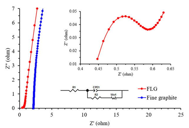 Figure 6 Equivalent circuit representation and Nyquist plot of the FLG and fine graphite coated electrode in the frequency range of 0.1 - 100,000 Hz by applying an AC at 5 mV.