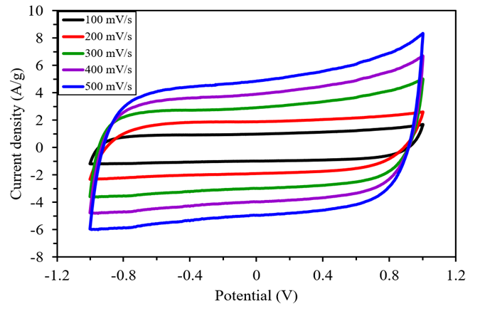 Cyclic voltammetry (CV) analysis of symmetric supercapacitors provides important information about their charge storage behavior and electrochemical performance. CV curves with a quasi-rectangular shape at different scan rates (100 - 500 mV s −1 ) are shown in Error! Reference source not found. . This is indicative of double-layer capacitance with negligible Faradaic contributions. Furthermore, the excellent reversibility and stability of the electrode material are confirmed by the symmetry between the positive and negative current densities. The potential window of −1 to 1 V further reinforces the suitability of the aqueous or stable electrolyte system, as no significant Faradaic redox peaks are observed, confirming the dominance of double-layer charge storage mechanisms [62].
