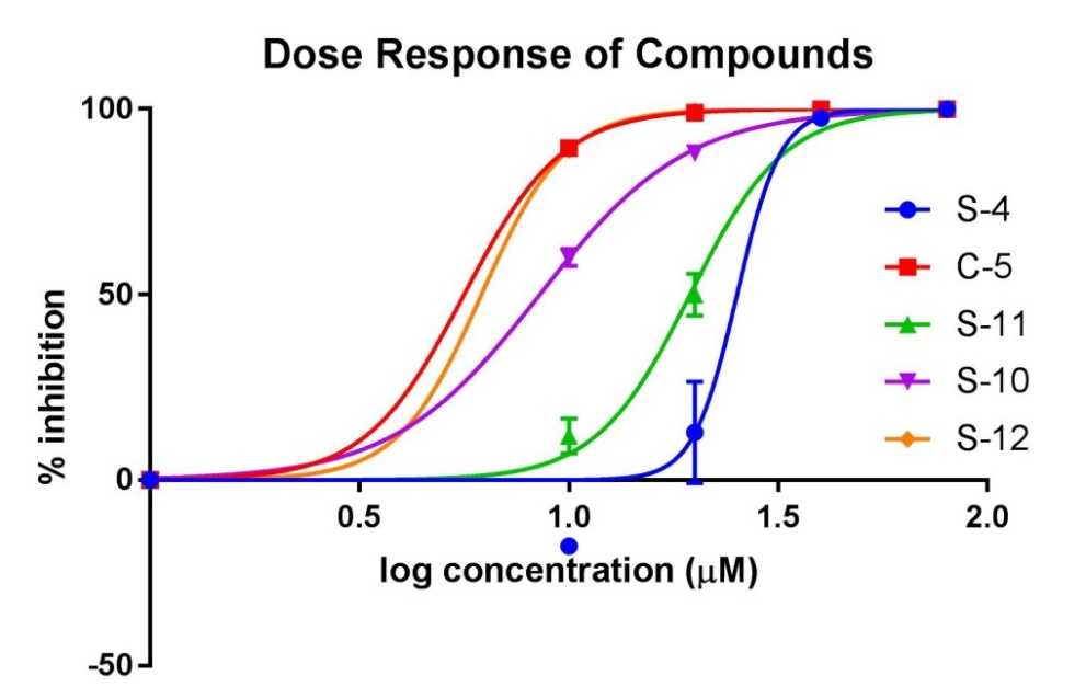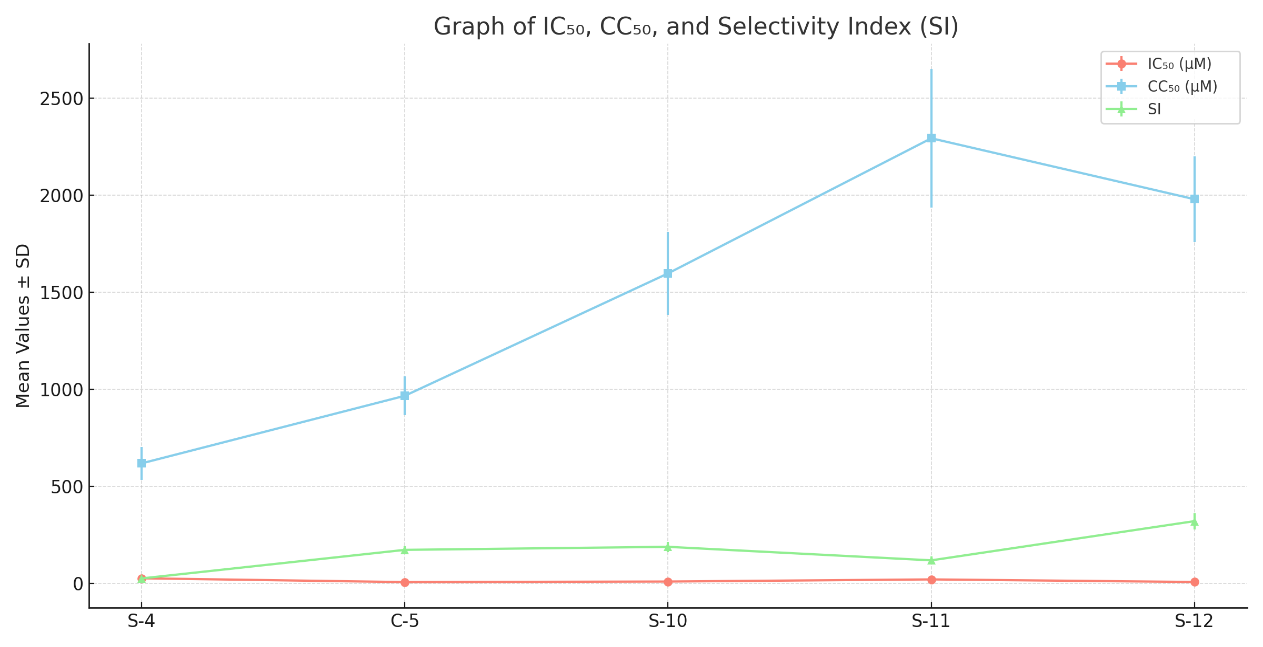 As this was an initial screening study, formal randomization was not applied . To reduce potential bias, all compounds were anonymized using coded identifiers (e.g., S-1, S-10, C-3, and C-5), and distributed in a balanced, non-systematic order across microplates to minimize the edge effects and positional bias. Cytotoxicity (MTT assay) and antiviral activity (qRT-PCR) were independently assessed by 2 researchers using instrument-based measurements. Blinding of compound identities further ensured objectivity.