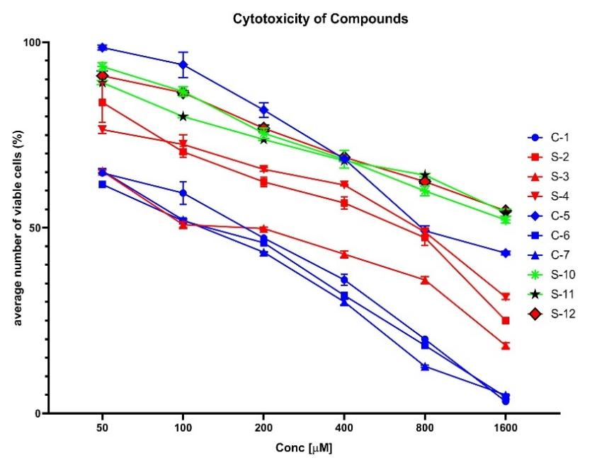 Thereafter, Vero cells were treated with the test compounds at dilutions of 1600, 800, 400, 200, 100, and 50 µM in triplicate and incubated for 48 h. Finally, the absorbance was measured at 560 and 750 nm. Cell viability was determined using the following equation [27,28]: % Viable cells = (Treatment Absorbance – Control Medium Absorbance)/(Negative Control Absorbance – Control Medium Absorbance)×100%. Results were obtained using a nonlinear regression equation (analysis 4-parameter logistic model) using GraphPad Prism 8.3.0 software. The results are expressed as the 50% Cytotoxic Dose (CC 50 ).
