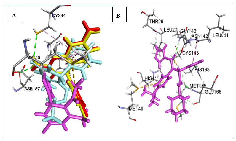 In comparison, S-4 ( Figure 4(A) ; purple color) adopted a less favorable orientation relative to X77 ( Figure 4(B) ). It interacted with His-41 primarily through van der Waals forces, which were insufficient to secure strong binding. Structurally, S-4 contained thiophene, methyl, and thioxo groups that increased lipophilicity but provided limited opportunities for hydrogen bonding with the catalytic residues, leading to weaker stabilization in the active site [59].