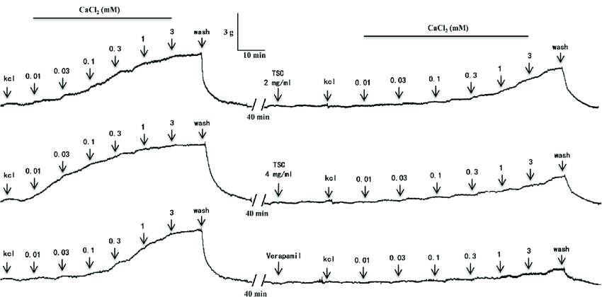 The figure demonstrates the calcium entry blockade potential of TSC, as evidenced by the reduced contractile force compared to control. After an initial equilibration period in Ca²⁺-free Krebs solution, the tissue is subjected to cumulative addition of CaCl₂ in increasing concentrations, typically ranging from 0.1 mM to 2.5 mM. This stepwise increase allows for the generation of a concentration–response curve, reflecting the tissue’s sensitivity to calcium and its capacity to restore contraction in a dose-dependent manner ( Figure 6 ).