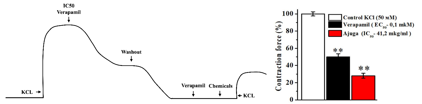 Figure 5 Left: Schematic representation of the experimental design for assessing the vasorelaxant effect of Ajuga extract using isolated aortic rings precontracted with 50 mM KCl. Verapamil (IC₅₀ = 0.1 µM) was used as a reference calcium channel blocker. Following washout, the combined effect of verapamil and test chemicals (Ajuga extract) was evaluated. Right: Quantitative comparison of contraction force (%) in rat aortic rings after treatment with KCl (control), verapamil, and Ajuga extract (IC₅₀ = 41.2 µg/mL). Data are presented as mean ± SEM; p-value < 0.01 compared to control.