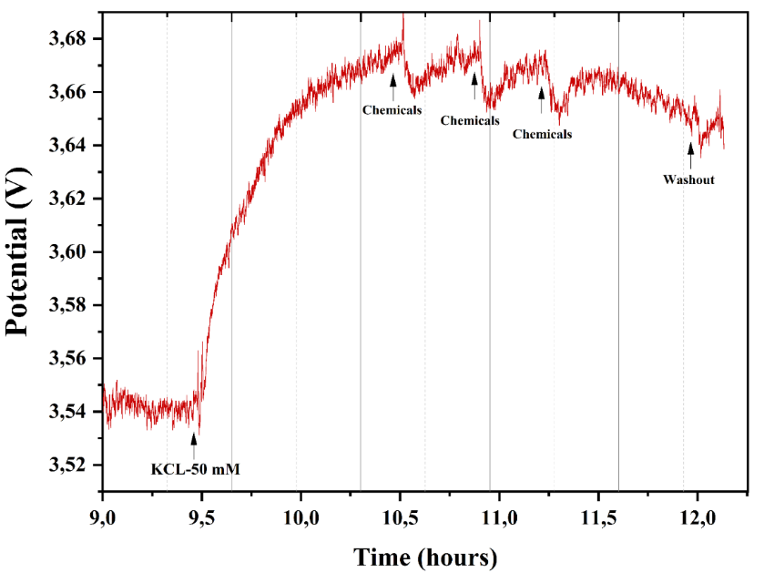 Figure 4 Representative potential change recorded over a 3-hour period in response to sequential chemical applications following membrane depolarization by 50 mM KCl. The initial sharp rise in potential at ~9.5 h corresponds to KCl-induced depolarization. Subsequent additions of test chemicals (indicated by arrows) elicited modulating effects on membrane potential, followed by partial recovery upon washout. The graph demonstrates the dynamic electrophysiological response of the system to chemical interventions.