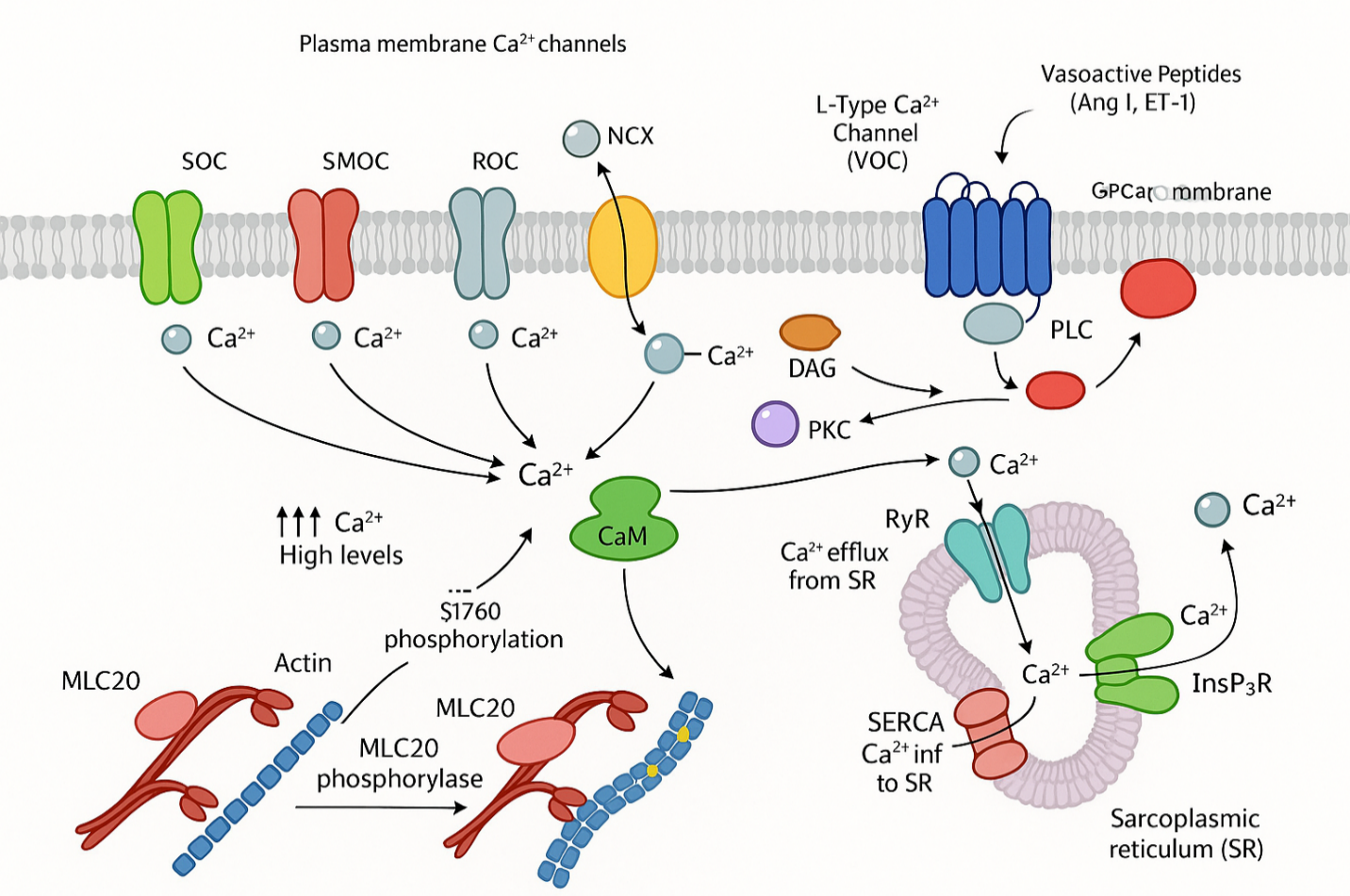 As intracellular Ca²⁺ levels rise, Ca²⁺ binds to calmodulin, forming a Ca²⁺–calmodulin complex that activates myosin light chain kinase (MLCK). MLCK phosphorylates the regulatory light chains of myosin, enabling cross-bridge formation with actin filaments and initiating contraction. Relaxation occurs when intracellular Ca²⁺ levels fall, either through active reuptake into the SR via SERCA (sarcoplasmic/endoplasmic reticulum Ca²⁺ ATPase) or extrusion across the plasma membrane by plasma membrane Ca²⁺ ATPase (PMCA) and Na⁺/Ca²⁺ exchangers (NCX) [21].