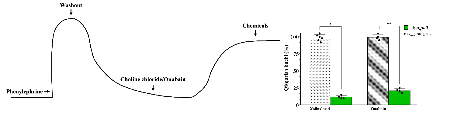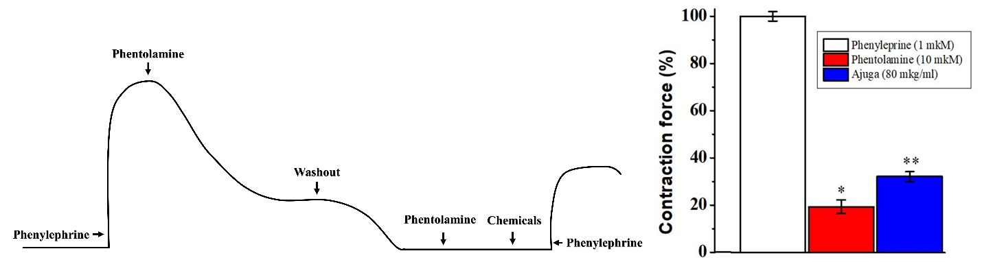 Figure 8 Assessment of the vasorelaxant effect of test compounds on α₁-adrenergic receptor–mediated contraction in isolated rat aortic rings. The left panel illustrates the experimental protocol: Phenylephrine (1 μM) induced sustained contraction, followed by the addition of the selective α₁-blocker phentolamine (10 μM), washout and subsequent co-application of phentolamine and the test compound (Ajuga extract).