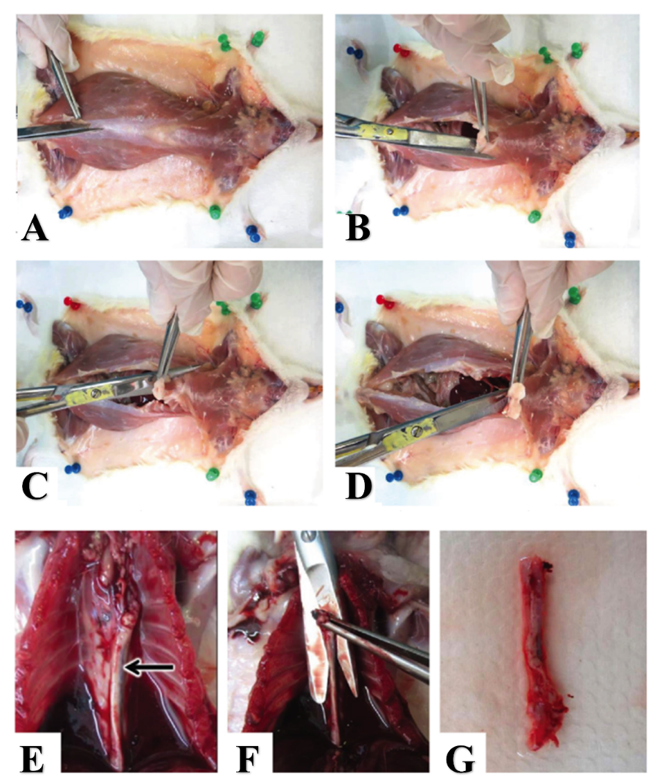 Figure 2 Dissection and isolation of the thoracic aorta and spinal cord in a rodent model (A - D) .