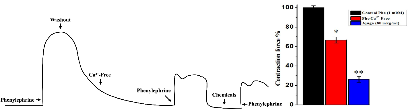 Figure 9 Evaluation of the role of extracellular Ca²⁺ in phenylephrine (Phe)-induced vasoconstriction and the inhibitory effect of Ajuga extract. The experimental protocol (left) involved contraction with phenylephrine (1 μM), followed by washout and incubation in Ca²⁺-free solution to assess Ca²⁺-dependent tone. Re-application of phenylephrine and treatment with Ajuga (80 μg/mL) were then performed.
