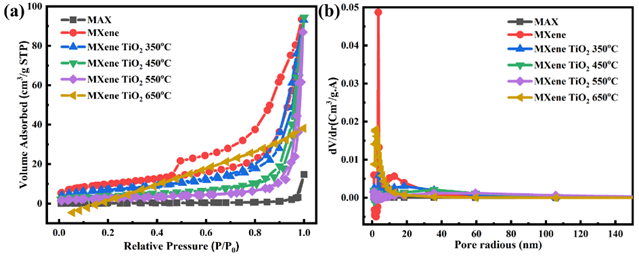 Figure 4 (a) N2 adsorption-desorption isotherms of the samples, and (f) BJH pore size distribution of MXene samples.
