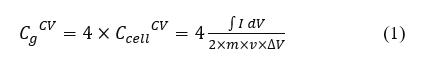 The performance of the supercapattery was analyzed after calculating several parameters, including specific capacitance, energy density, and power density. Capacitance is the ability of a material to hold an electrical charge [23]. Meanwhile, specific capacitance can be defined as capacitance related to a specific entity, such as area, volume, or mass [24]. In this research, gravimetric capacitance has been calculated based on the mass of the electrode’s active material, expressed in Farads per gram (F/g) [25]. CV test was carried out in a 3-electrode system for a single electrode (Cg)and a 2-electrode system for a coin cell device (Ccell). CV curves can be used to calculate the specific capacitance of a single electrode (CgCV) and the 2-electrode cell (CcellCV) using Eq. (1) [26].