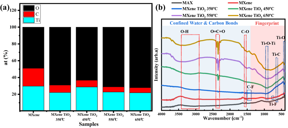Figure 3(b) shows the FTIR spectra, revealing the evolution of chemical functional groups across the samples. FTIR analysis provides further evidence of the chemical changes induced by HF etching and thermal oxidation. First, the FTIR region corresponding to the fingerprint vibration of the material in the range of 400 - 1,400 cm−1 [33]. Materials fingerprint vibration, including Ti-O stretching [34], Ti-C stretching, Ti-F bending [33], Ti-O-Ti [35], and C-F stretching [33], are detected at wavenumbers of 400 - 430, 631, 756, 923 and 1,300 - 1,500 cm−1, respectively. Second, the FTIR region corresponding to confined water and carbon bond vibrations, in the range of 1,400 - 4,000 cm−1. Confined water vibrations, including O-H stretching [36], were detected at wavenumbers of 2,900 - 3,500 cm−1. The carbon bond vibration, including C-O stretching [37], and O=C=O bonds [38] were detected at wavenumbers of 1,557 and 2,300 - 2,400 cm−1. The spectrum of MXene, compared to the MAX phase, shows the appearance of new vibrations - including C-F stretching, Ti-F bending, Ti-O stretching, and Ti-O-Ti-confirming that HF etching successfully replaced Al atoms with oxygen- and fluorine-containing functional groups (-O, -OH, -F) [7]. The FTIR spectra of the annealed samples reveal the progression of oxidation. The Ti-F bond disappears entirely after heat treatment, and the C-F bond weakens significantly in MXene TiO2 350°C and vanishes at higher temperatures. Concurrently, the intensities of the Ti-O and Ti-O-Ti peaks deepen with increasing temperature, confirming the increasing formation of more TiO2 [20]. The appearance and intensification of C-O stretching and O=C=O bonds indicate carbon oxidation and CO2 adsorption on the material surface during annealing [34,39]. The persistence of the Ti-C bond across all samples except MXene TiO2 650 °C suggests the core MXene structure remains largely intact up to 550 °C, with severe oxidation occurring only at the highest temperature.