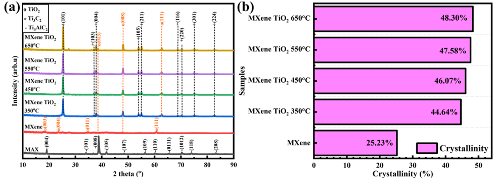 The Al layer from Ti3AlC2 was removed using a selective etching process using an HF solution. The 1 g MAX powder was completely dissolved in 20 mL of HF and then mixed for 24 h. The sediments were washed with DI water until the supernatant pH was higher than 6. The sediment was dried using a hot plate at 100 °C for 6 h, resulting in MXene powders. The MXene TiO2 was achieved by annealing the MXene powder at various temperatures (350, 450, 550, and 650 °C) using a furnace under air conditions for 1 h. MXene synthesis and modification illustrations are shown in Figure 1(a).