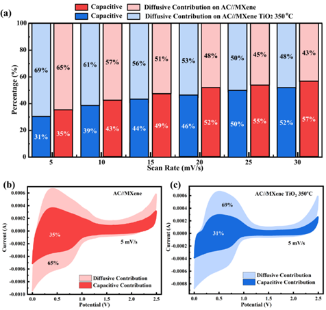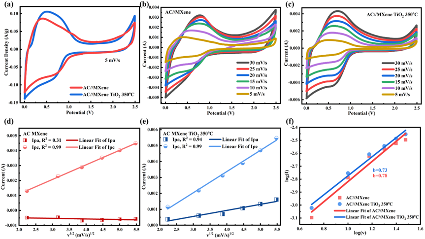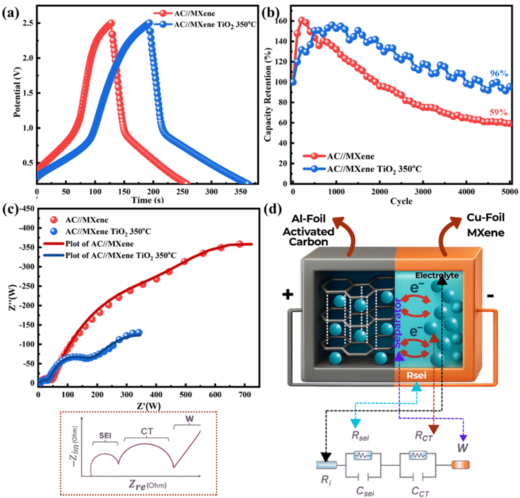 The impedance analysis was carried out from the Nyquist plot (Figure 10(c)) with the possible circuit model shown in Figure 10(d). This model shares similar characteristics with those found in battery components. Equivalent series resistance (ESR) was obtained from the intercept of the Z’-axis, which relates to the resistance of the current collector/electrode interface, electrolyte ions, and electrode materials [51]. The ESR value of AC//MXene TiO2 350 °C is 6.13 Ω, lower than that of AC//MXene (8.36 Ω). The first semicircle at the high frequency appeared due to the ion diffusion through the SEI layer during the formation and decomposition of the electrolyte. This region, represented by R and CPE elements, represents the resistance and capacitance of SEI [54]. The first semicircle of AC//MXene TiO2 350 °C is much lower Rsei = 22.62 Ω than AC//MXene Rsei = 31.67 Ω. The second semicircle at the middle frequency represents the charge transfer during the electrode reaction, as indicated by the R and CPE elements. The ions adsorb at the surface of the electrode to form a double layer on the interface, and the energy storage process occurs [54]. The second semicircle of AC//MXene TiO2 350 is also lower, Rct = 87.05 Ω, than AC//MXene Rct = 339.29 Ω. At high frequency, a straight line at an angle close to 45° related to the Warburg impedance represents ion diffusion or transport in the electrolyte and the electrode surface [55]. The slope of AC//MXene TiO2 350 °C is much higher than that of AC//MXene, indicating the low ion diffusion resistance from the electrolyte to the electrodes [53].