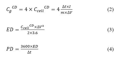 where Δt are discharging time (s), I is current, ED represents the energy density (Wh/kg), and PD is power density (W/kg).