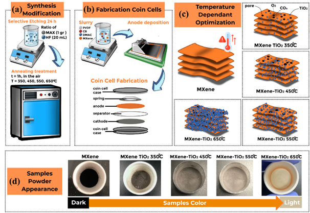 Figure 1 Schematic illustration of the (a) MXene synthesis by HF etching and subsequent annealing in air at varying temperatures (350 - 650 °C), (b) Fabrication process of the coin cell supercapattery, including slurry preparation, electrode deposition, and cell assembly with activated carbon as the cathode and MXene or MXene-TiO2 composites as the anode, (c) the temperature-dependent optimization of MXene, and (d) Final appearance of sample powder.