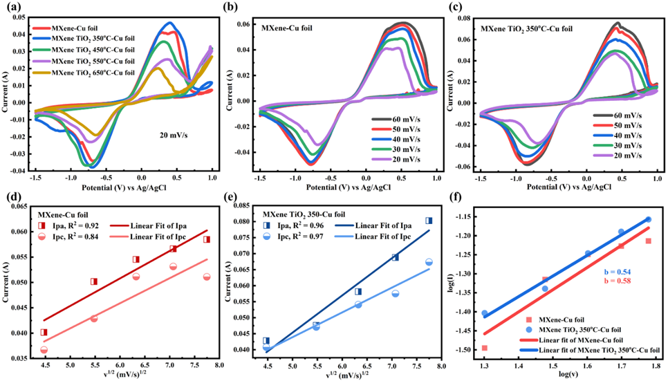 Figures 4(a) and 4(b) Adsorption-Desorption Isotherms and Pore Size Distribution. The textural properties, which are critical for ion transport in supercapatteries, reveal a crucial trade-off driven by the oxidation level. N2 adsorption-desorption isotherms are shown in the graph from Figure 4(a). All samples demonstrate a type IV isotherm and H3 hysteresis loop. The isotherm IV type is related to mesoporous materials (2 - 50 nm in diameter) [40]. The H3 loop type suggests the presence of plate-like particles forming non-rigid aggregates, typical of the MXene-derived structure. The loss of C atoms and the generation of COx gas during oxidation directly led to the formation of these pores; consequently, pore size generally increased with annealing temperature due to the accelerating oxidation rate (as confirmed by EDX. The pore diameter and specific surface area of the samples are shown in Table 2. All the materials have diameters in the range of 4 - 49 nm, indicating mesoporous materials, as confirmed by the Barret-Joyner-Halenda (BJH) pore size distributions in Figure 4(b). From these results, it can be confirmed that the higher the annealing temperature, the higher the oxidation level, and thus the pore size formed is larger, except for MXene at 650°C. However, despite the larger pore size, the Specific Surface Area (SSA) exhibited a drastic decrease as the temperature rose (from 35.6 m2g−1 for pure MXene down to a minimum of 10.3 m2g−1 at 550 °C). This reduction is the direct consequence of the high TiO2 formation (validated by XRD and high O content in EDX) at elevated temperatures. Specifically, the large amount of TiO2 acts detrimentally by covering the exposed MXene pores and filling the critical interlayer spacing. This TiO2 blockage prevents the surface area from increasing and, critically, inhibits ion transportation rather than acting as a beneficial spacer to prevent self-restacking. MXene 650 °C has the highest number of TiO2 confirmed by EDX and XRD. The specific surface area of pure MXene, MXene 350 °C, MXene 450 °C, MXene 550 °C, and MXene 650 °C are 35.6, 25.6, 14.5, 10.3, and 15.7 m2g−1, respectively. The surface area value decreases with increasing annealing temperature, despite the pore size increasing. This is because the surface area is also affected by other factors, such as the number and size of MXene pores, the value of MXene interlayer spacing, and the amount and size of TiO2 [19,41]. Based on the XRD data, the annealing treatment (from 350 to 650 °C) has a negligible effect on the interlayer spacing; therefore, the decrease in surface area is mainly attributed to the formation of TiO2. The surface area will not increase when TiO2 covers the pores and the MXene interlayer spacing, despite the increase in the number of pores. Additionally, a TiO2 size that is too large will occupy the interlayer space, preventing it from acting as a spacer and inhibiting ion transportation.