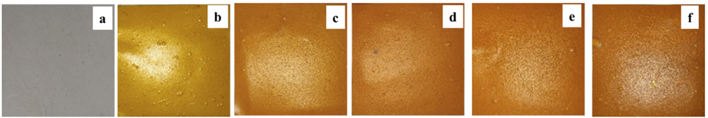 Figure 1 Intelligent indicator films based on CF/PVAwith turmeric concentrations of 0% (a), 0.1% (b), 0.2% (c), 0.3% (d), 0.4% (e), and 0.5% (f).
