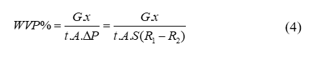 where G/t is the rate of gain in weight over time (the slope of the line, in g·s−1/h), A is the permeation area (m2), x is the thickness of the film (mm), ΔP is the difference in relative humidity between the 2 sides of the film the external side (R1, 75% R.H.) and the internal side of the cup (R2, 0% R.H.) expressed in kPa, and S is the partial pressure of saturated water vapor at the test temperature (kPa)