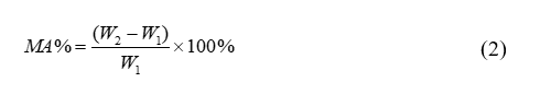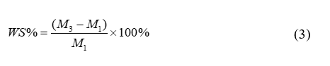 The water solubility (WS) of the films was determined with a modified method based on Dăescu et al. [11]. Film samples of all formulations were cut into 2.0×2.0 cm2 pieces and dried in a hot air oven at 105 °C until a constant weight was obtained (M1). The dried samples were then immersed in 50 mL of distilled water and shaken in a shaker at 120 rpm at a temperature of 30 ± 2 °C for 1 hour. After immersion, the undissolved film residues were carefully filtered using filter paper and weighed (M2). Subsequently, the filtered samples were re-dried at 105 °C until a constant weight was achieved (M3). The obtained values were used to calculate the water solubility of the films using the following Eq (3).
