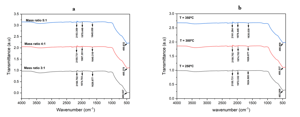 Characterization results of aluminium nitride synthesis, employing mass ratios of Al(OH₃):C of 3:1, 4:1 and 5:1 with nitridation conducted at a temperature of 300 °C using a hydrothermal autoclave shown in Figure 2(a). This characterization serves as an initial screening to ascertain the most optimal mass ratio for aluminium nitride synthesis via the CRN–hydrothermal autoclave-assisted method. The results indicate that aluminium nitride starts formation within the wavelength range of 200 - 300 cm⁻¹. The maximum absorption peak of Al-N bonds is observed at 488 cm⁻¹ for mass ratio 3:1, 485 cm⁻¹ for mass ratio 4:1 and 480 cm⁻¹ for mass ratio 5:1. The peaks at ~ 2,152 cm⁻¹, ~ 1,979 cm⁻¹ and ~ 1,626 cm⁻¹ indicate the presence of OH bending vibrations resulting from the absorption of H₂O molecules or remaining O-H compounds in the precursor. This is in accordance with research findings from [30,31]. Due to sample with mass ratio 3:1 exhibiting the broadest peak, its mass ratio of Al(OH)₃:C (3:1) was selected as the precursor reference for nitridation analysis by hydrothermal autoclave at varying temperatures of 250 and 350 °C.
