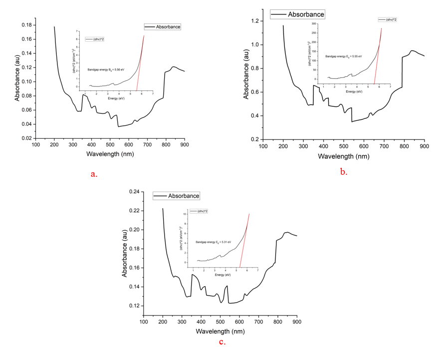 where: α = coefficient of absorbance (α = 2.303 A), h = Planck’s constant, v = light frequency (hν = 1,240/λ), λ = wavelength (nm) and Eg = band gap energy (eV).