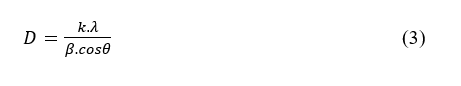 where; D = Diameter of particle, k = Debye–Scherrer constant (0.89), λ = X-ray wavelength (1.54060 Å), β = FWHM, and θ = Bragg angle.