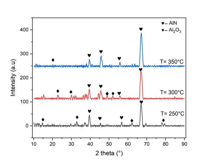 Figure 3 illustrates the XRD pattern of the nitridized product with different nitridation temperatures and a mass ratio of Al(OH)₃:C = 3:1. The XRD patterns exhibit a distinct evolution in phase composition and crystallinity as the nitridation temperature increases. The diffraction peaks are comparatively broad and weak at 250 °C, indicating the presence of predominantly amorphous or weakly crystalline phases. Several pointed reflections that correspond to γ-Al₂O₃ are still observed, indicating that the transformation of aluminium hydroxide to AlN is still incomplete at this particular stage. The characteristic diffraction peaks of AlN are not clearly visible and are barely detectable. With the temperature nitridation of 300 °C the strength of the AlN peak becomes more prominent, while the Al₂O₃ reflection decreases, signifying a partial conversion of the oxide phase into AlN. The diffraction peaks sharpen and shift slightly, signifying the formation of a more organized AlN crystalline structure.