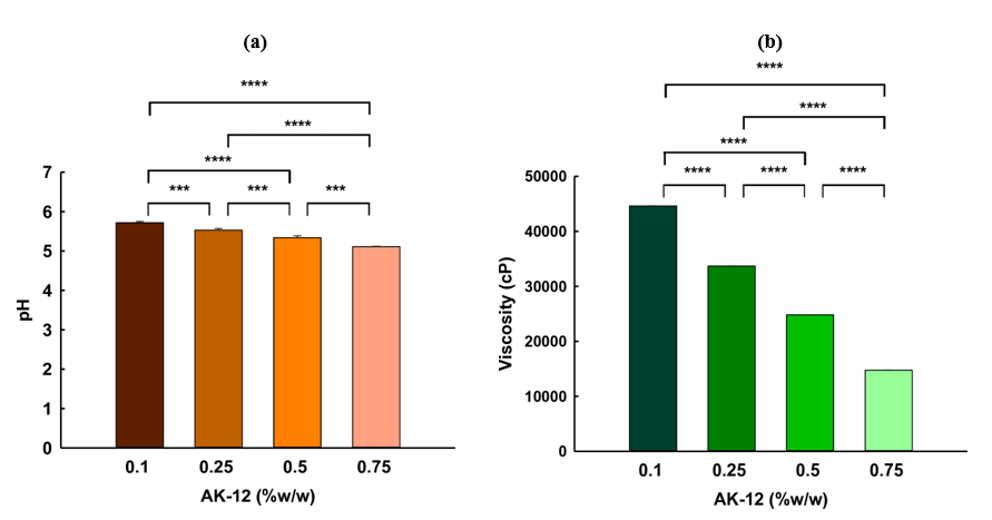 Figure 1 The influence of synthetic peptide concentration (%w/w) upon (a) pH and (b) viscosity (cP) of the resulting formulation. Asterisks indicate values with significant differences when comparisons are drawn between groups (***p-value < 0.001, **** p-value < 0.0001).