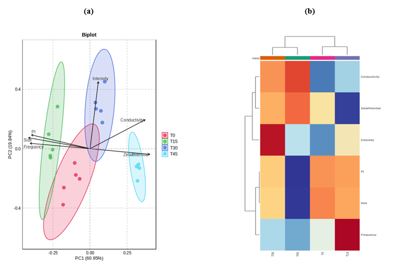 Figure 5(a) presents the Principal Component Analysis (PCA) biplot, exhibiting the changes as the nanoemulsion evolves over time. Together, PC1 and PC2 can account for 80.79% of the total variance. The patterns reveal distinct clusters. The first, shown in red, represents the T0 samples, with a greater polydispersity index that suggests heterogeneity as the initial formulation develops. Next, the T15 samples are shown in green, and these are strongly linked to frequency parameters and smaller droplet sizes, indicative of the initial stabilization taking place relatively quickly. The samples for T30 samples are shown in blue, and are closely correlated to intensity measurements. Finally, the T45 samples shown in cyan have the greatest association with the conductivity vectors and zeta potential, suggesting that electrostatic stabilization takes place progressively over time. PCA clearly reveals the various relationships arising over time between different physicochemical parameters, whereby the initial position of variables from the origin makes a considerable contribution to the eventual sample differentiation. In Figure 5(b), the hierarchical clustered heatmap is presented, allowing the earlier findings to be visualized through an alternative perspective. In this view, one hierarchical cluster comprises T0 and T15, while a second comprises T30 and T45, thus showing a pair of different stability phases. These parameter clusters indicate the similarities in behavior between conductivity and zeta potential, and between size and polydispersity index. From the original color gradient it can be observed that the sample for T45 shows the best combination of low polydispersity, a moderate droplet size, and greater zeta potential values (-60 mV). All of these qualities lead to better nanoemulsion stability. The results concur with those of McClements [29], whose work revealed that when nanoemulsions achieve electrokinetic equilibrium, their stability over the longer term is enhanced via combined electrosteric mechanisms, especially if the absolute value of the zeta potential is greater than 25 mV while the polydispersity index is lower than 0.3.