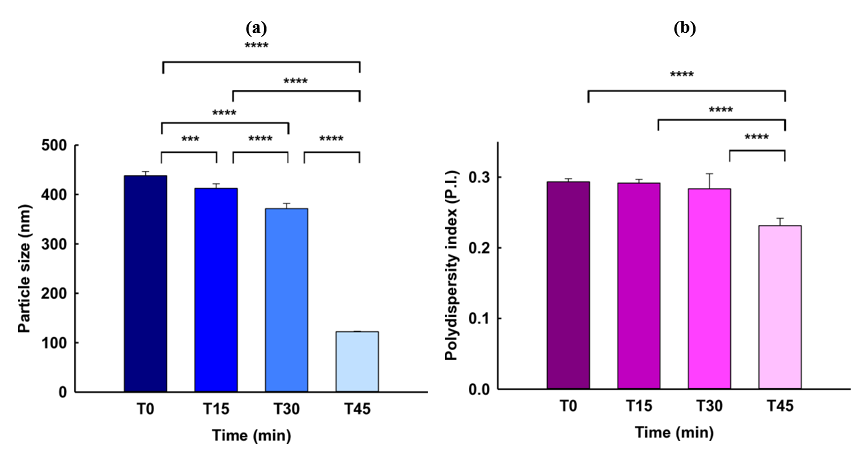 Figure 3 Changes in (a) particle size and (b) polydispersity index (P.I.) for various time intervals (T0, T15, T30, T45). Asterisks indicate values with significant differences between groups (*** p-value < 0.001 and **** p-value < 0.0001).