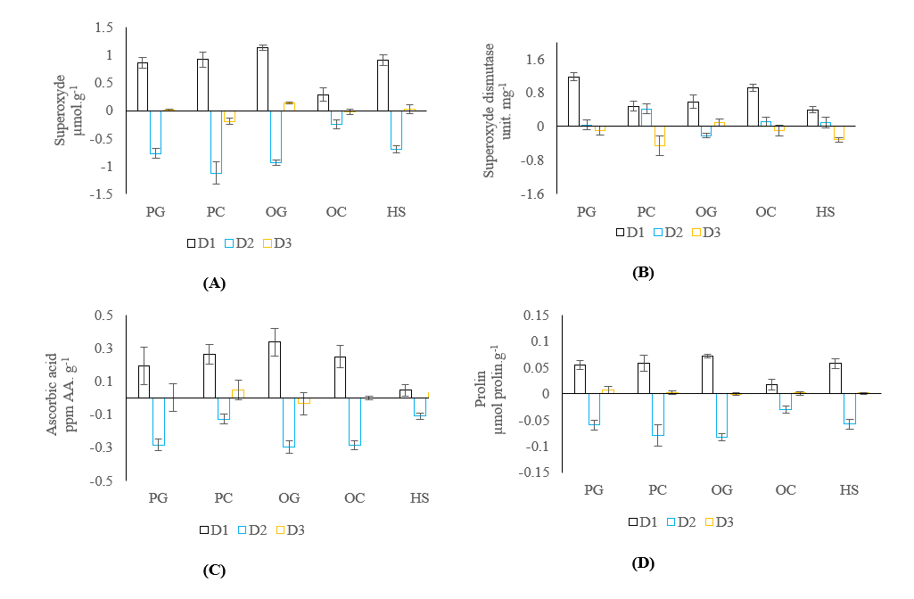 Plant defense mechanisms against drought-induced oxidative stress were triggered due to the rise in superoxide activity. The increased activity of superoxide free radicals was responded to by increased production of antioxidants in the form of superoxide dismutase (SOD), ascorbic acid, and proline (Figures 7(B) and 7(D)). The release of SOD and ascorbic acid antioxidants in the PC plant was lower than that of OC (Figures 7(B) and 7(C)). The plant-defense strategy in the OC plant involved SOD and ascorbic acid. Those increased at the same rate as that of PG and OG, even exceeding that of HS (Figures 7(B) and 7(C)). This indicated a higher tolerance of OC towards oxidative stress. The combination of increased superoxide activity at a smaller rate and higher production of antioxidants in the form of SOD and ascorbic acid caused the OC plant to adapt to drought stress better than PC. On the other hand, PC was adapted through the production of ascorbic acid and proline, similar to that of PG (Figures 7(C) and 7(D)).