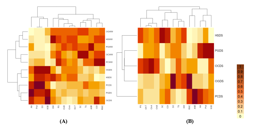 Figure 8 Heatmap clustering of physiological activity of cocoa plants from various propagation methods under drought stress conditions (A) and after rewatering (B). HS = hybrid seed, OC = orthotropic cutting, PC = plagiotropic cutting, OG = orthotropic grafting, PG = plagiotropic grafting, WW = well watered, DS = drought stress, RWC = relative water content, PS = photosynthetic rate, SC = stomata conductance, TS = transpiration, COI = CO2 intercellular, Ch-A = chlorophyll A, Ch-B = chlorophyll B, Ch-T = Chlorophyll total, ANR = activity of nitrate reductase, AA = ascorbic acid, Prol = proline, SO = superoxide, SOD = superoxide dismutase and DW = dry weight.