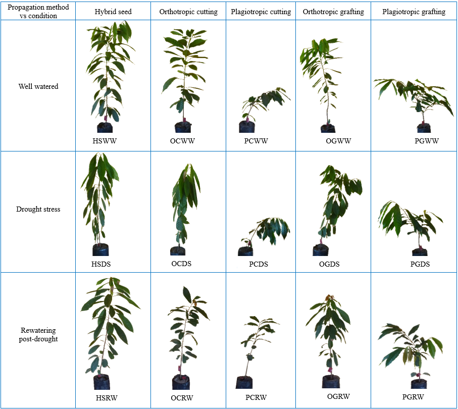 Studies on the adaptability of cocoa plants during drought stress have been intensively conducted on hybrid seeds and grafting-origin plants [6,7,16,17]. These studies were done mainly in greenhouses by decreasing the soil moisture content up to 25% of field capacity conditions [17] and modifying watering intervals [7]. The evaluation includes the first appearance of drought symptoms [16] and decreased leaf water potential [6]. However, no information is avalable regarding the evaluation of cocoa plants under drought originating from OC and PC compared to existing propagation methods such as OG, PG and HS.