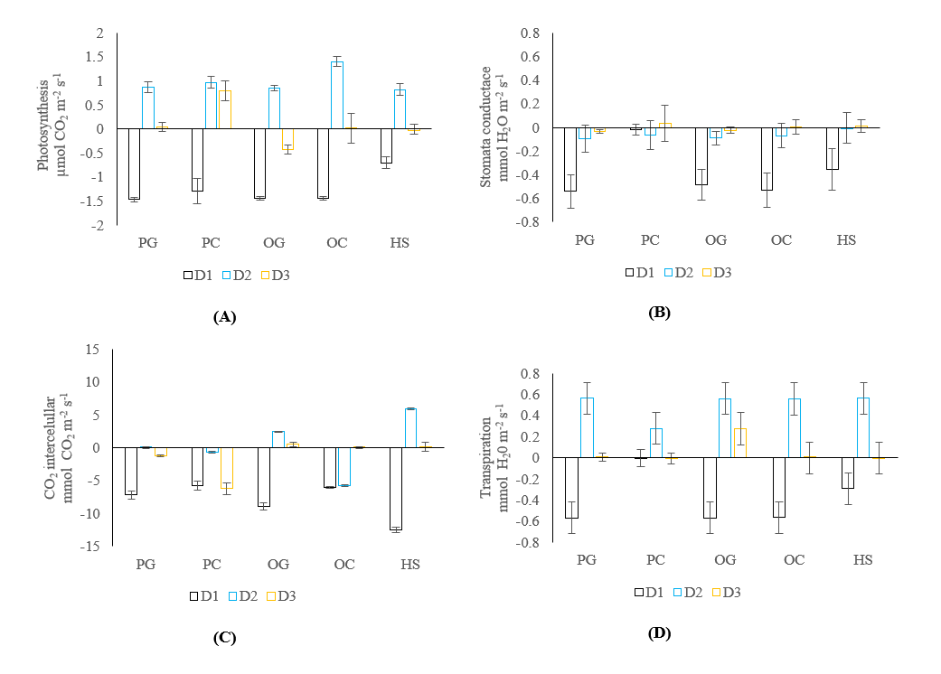 Figure 5 Photosynthetic activities of cocoa plants from various propagation methods based on photosynthetic rate (A), stomatal conductance (B), intercellular CO2 (C) and transpiration rate (D). D1= the difference between drought stress and well watered conditions, D2 = the difference between rewatering and drought stress conditions, D3 = the difference between rewatering and well watered conditions. Negative values indicate a decrease, and positive values indicate an increase in respective photosynthetic rate, stomatal conductance, intercellular CO2, and transpiration rate.