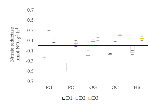 Figure 6 Nitrate reductase activity (NRA) in cocoa plants from various propagation methods. D1 = the difference between drought stress and well watered conditions, D2 = the difference in between rewatering and drought stress conditions, D3 = the difference between rewatering and well watered conditions. Negative values indicate a decrease, and positive values indicate an increase in nitrate reductase activity.