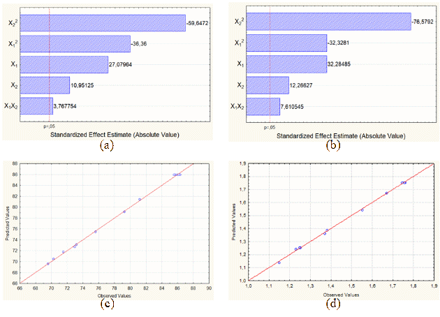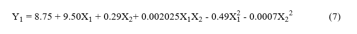 Curcumin was encapsulated into alginate-chitosan beads assisted by ultrasound. Subsequently, RSM was used to fine-tune the operating parameters of the time (X1) and power (X2). The experimental error (pure error) and data reproducibility were determined using the center point (run 9 - 13). To predict the encapsulation efficiency and swelling ratio, 2 equations, including 1st order (linear) and 2nd order (quadratic), were assessed. Table 2 shows a comparison of the linear and quadratic results in predicting the encapsulation efficiency and swelling ratio with respect to the sum of squares analysis.