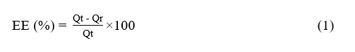 Encapsulation efficiency was assessed by quantifying the quantity of bioactive substances that remained unconfined within the alginate-chitosan beads after immersion in a CaCl2 solution. In this instance, the encapsulation efficiency is denoted as: