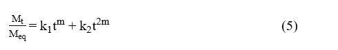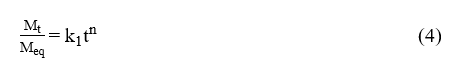 where k1 denotes the release rate constant based on the structural and geometric characteristics of the release system and n is the diffusion exponent. If n ≤ 0.43, the release mechanism is a molecular-diffusion-based bioactive compound release mechanism, whereas if n ≥ 0.85, it is a relaxation-based bioactive compound release mechanism during bioactive transport, which includes tension and state transitions in the polymer swells in water. If 0.43 < n < 0.85, the release of bioactive compounds is controlled by diffusion, followed by relaxation [25].