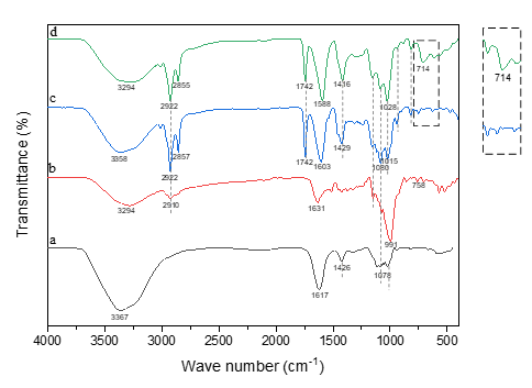 The best encapsulation outcomes were examined using a Perkin Elmer Spectrum IR 10.6.1 spectrophotometer (Perkin Elmer Inc., US). This analysis aimed to identify the functional groups present and characterize their properties within the spectral range of 4,000 - 400 cm−1.