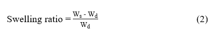 The swelling was assessed using a pH 7 buffer solution. The swelling percentage was calculated using the following formula: