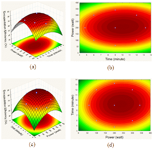 In the initial stage, pre-optimization screening was carried out at sonication time range of 0 - 15 min and power of 0 - 500 W to determine the variable limits. Response Surface Methodology (RSM) using a Central Composite Design (CCD) was employed to investigate the relationship between 2 variables (ultrasound time and power). The experimental design is summarized in Table 1. The variations in time (X1) and power (X2) of sonication were chosen as independent variables. The independent variables were set at a sonication time of 6 - 12 min and a sonication power of 100 - 300 W. For a combination of independent factors, the encapsulation efficiency and swelling degree were chosen as the responses. The real values of the independent variables must be translated into coded variables (−1, 0 and +1) for analysis using the response surface approach. Statistica 6.0 software was used to carry out the RSM/CCD study.